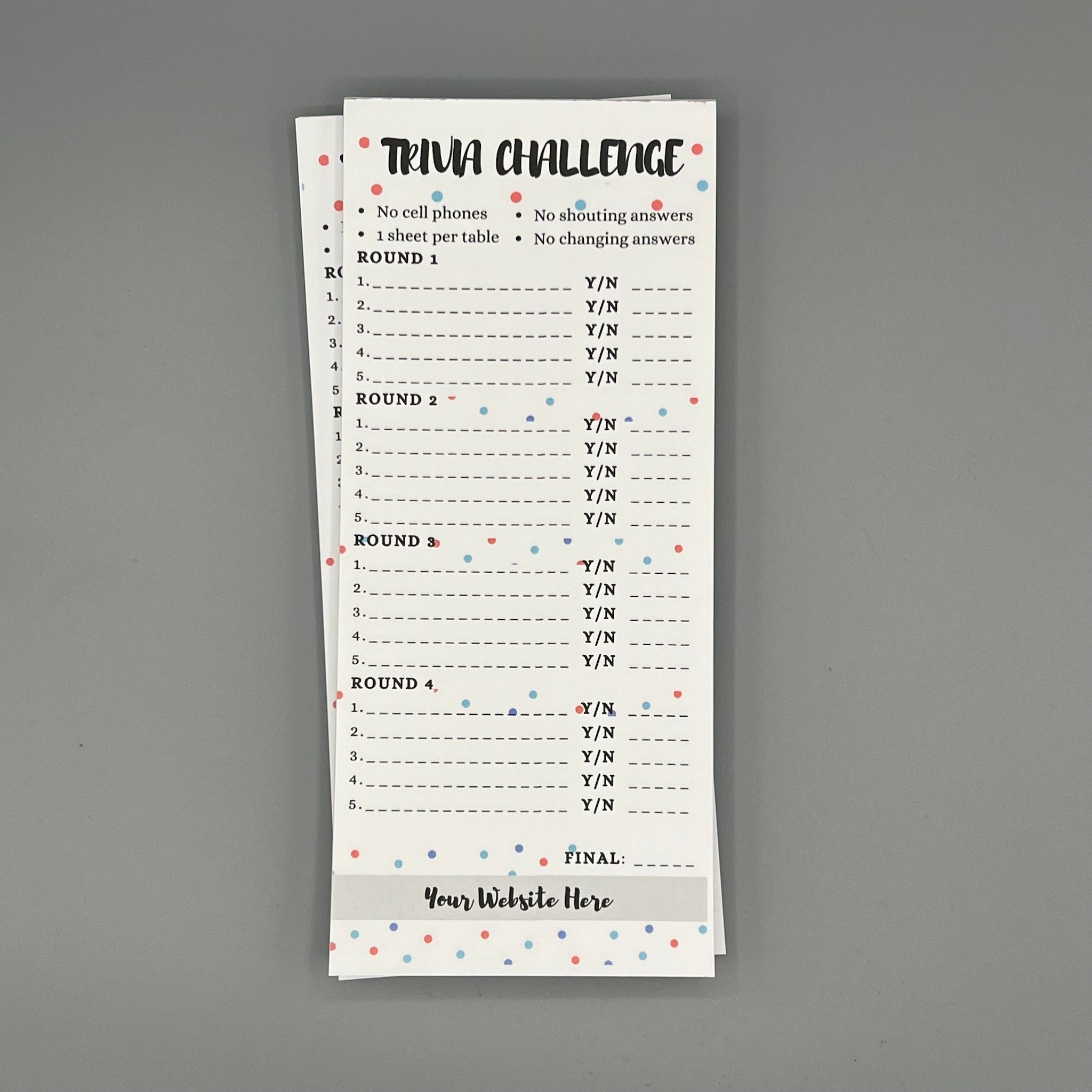 Customizable Sheet Count: Select a sheet count that suits your trivia night's needs. Whether players are taking a single sheet for use or a full pad for a question filled night, we've got what you need. Our pads are available with various page counts to accommodate all types of games and events.
